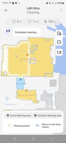 Initially I downloaded the required app and my mind was blown with how many options and features there are for this sturdily built little UFO. The first thing you want to do is clean your house, remove objects from floors and open all doors. Once you do this, you want to send it out in a quick scan of your home, which actually took about 40minutes to map out my 2000 sq foot house. During this mode, it is simply scanning your house. The map it created was very cool, and there’s tons of options to divide up rooms, label furniture, place off limit zones, list carpet (which it was able to detect itself), etc.