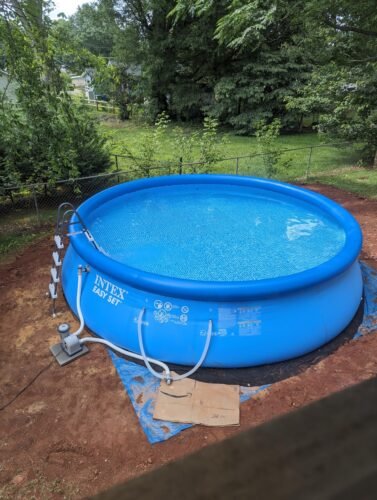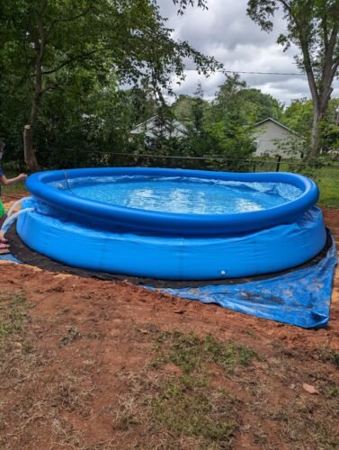 The most crucial aspect of setting up this pool is ensuring that the ground is level. It took three days for my husband, a friend, and me to get it properly leveled, especially when dealing with our rugged NC devil’s dirt. I learned that it’s essential to pay attention to the water flow when filling the pool – if the water is consistently flowing to one side, it’s a sign that thee pool is not level. Ignoring this could cause the pool to lean to one side when filled, as shown in the pictures.