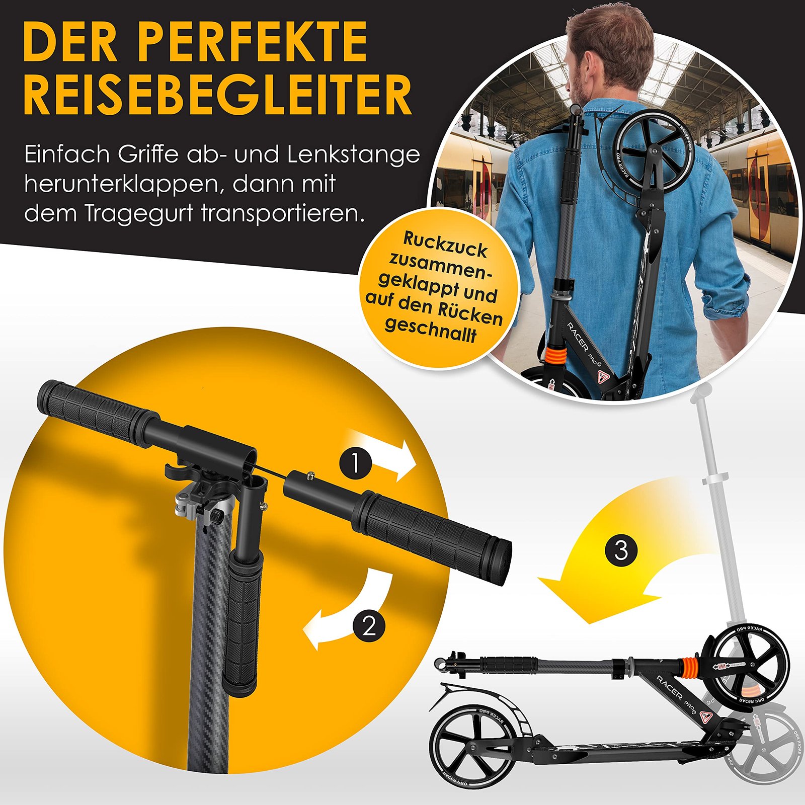 - Der Roller lässt sich klein zusammenklappen und lässt sich daher super platzsparend im Kofferraum transportieren.