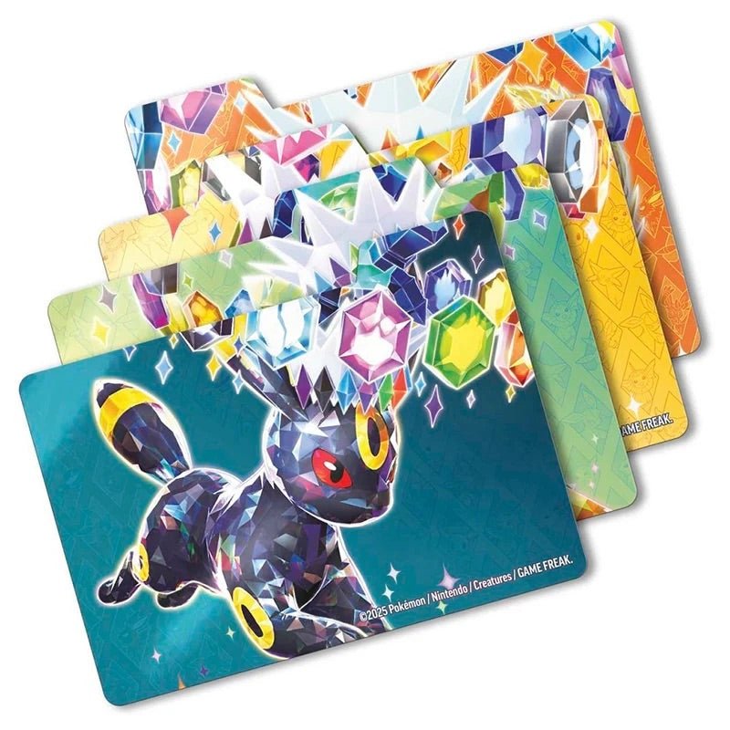 Includes four Scarlet & Violet—Prismatic Evolutions booster packs, one stylish storage box with four dividers and one random etched promo card featuring Eevee or one of its Evolutions as a Stellar Tera Pokémon ex