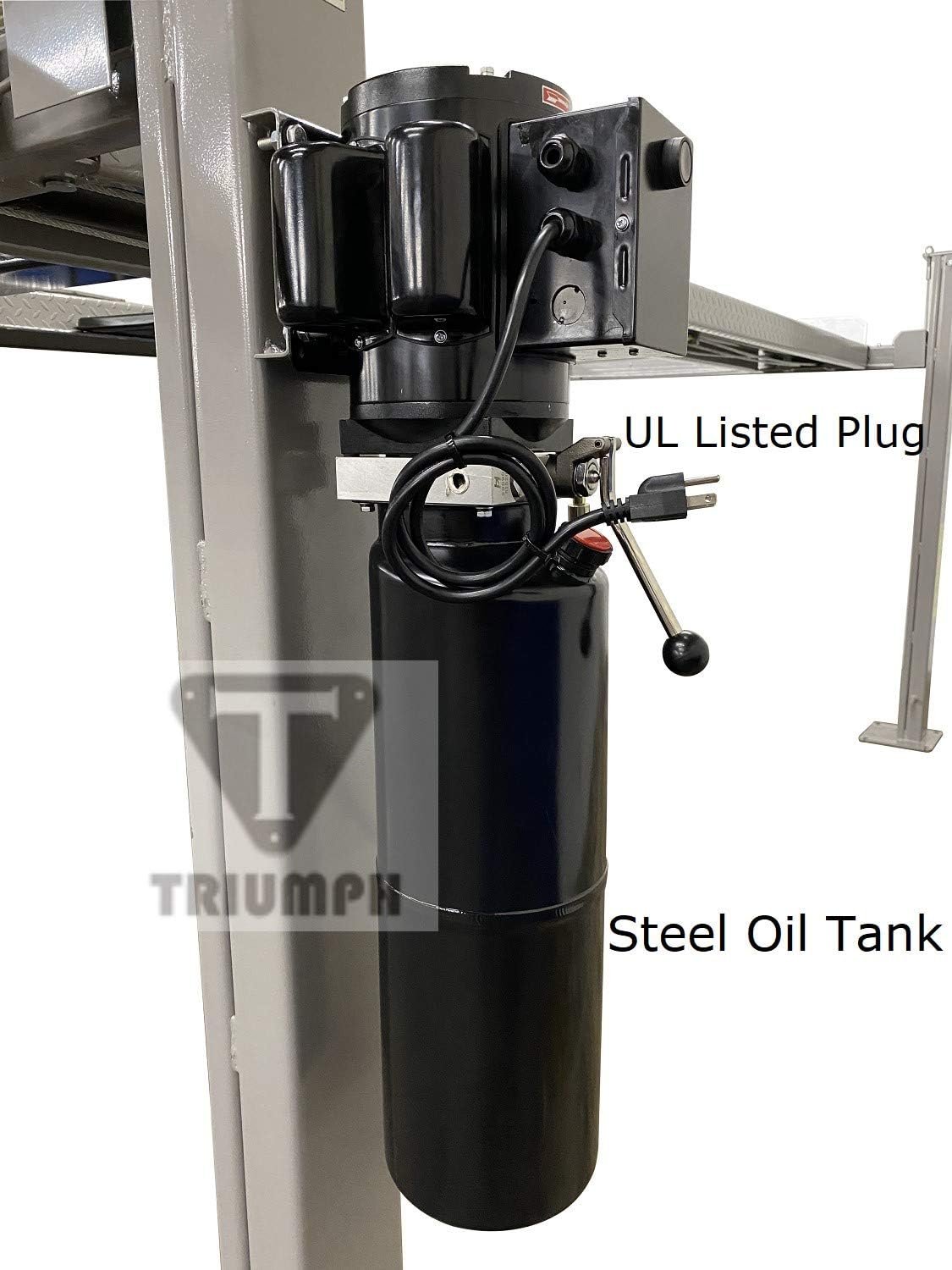 Featuring a drive-through width of 93″ (236 cm), this lift accommodates most vehicles. Built with a UL-listed power unit and steel oil tank, it ensures both safety and durability. The 4-post design allows vertical parking to double your space.