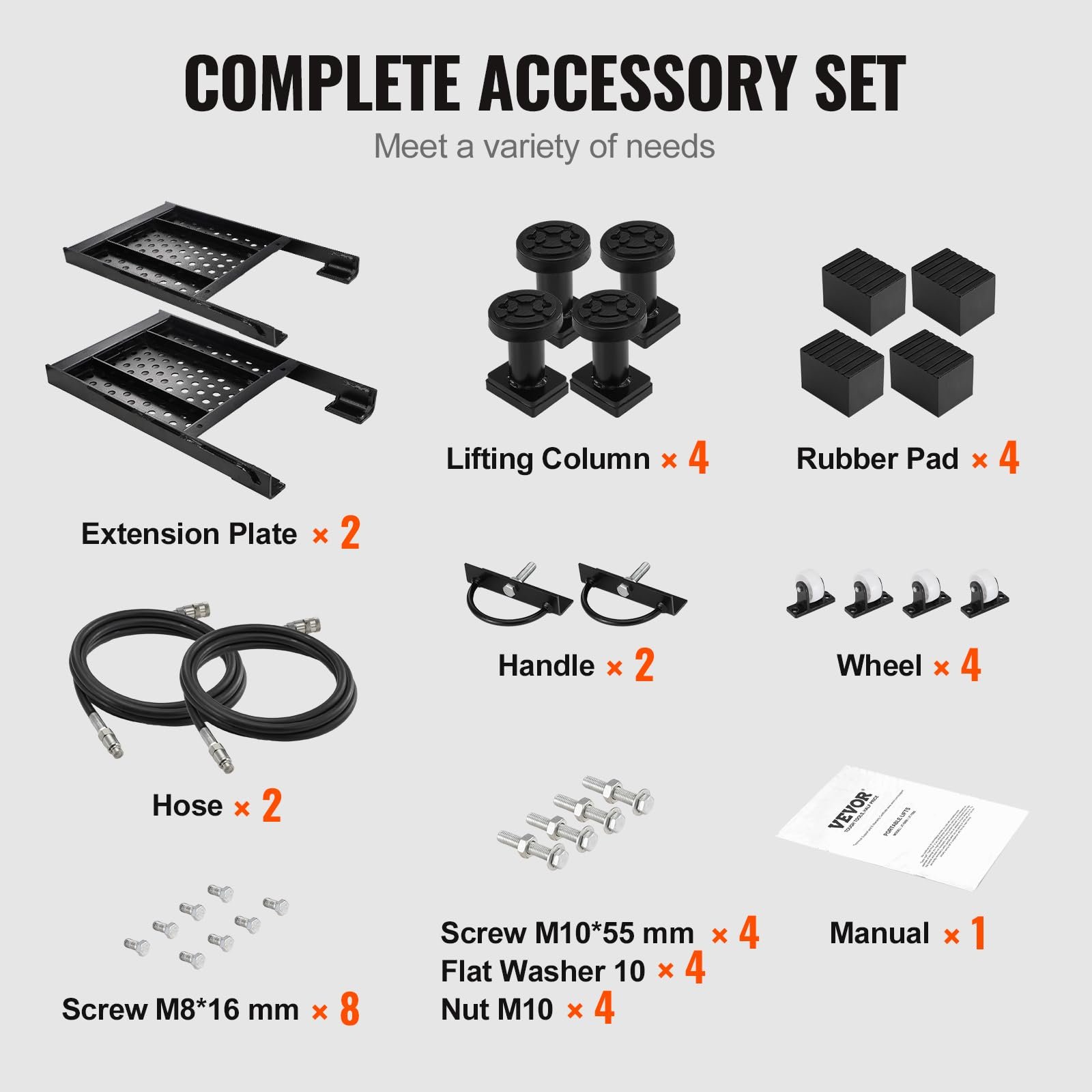 This lift comes in one large crate. Everything is packaged nicely. The hoses and lifts already have the fittings on them. The extenders and wheels are not assembled. I did not need to use the extenders on my Tesla model 3. Both of the lifts had the threaded inserts misaligned where the wheels attached and I was unable to use them because of it. Overall, it took longer to unpack everything than it did to set up the lift. It comes with both lifts, hoses, extension plates, a couple types of lifting blocks, and the pumping station.