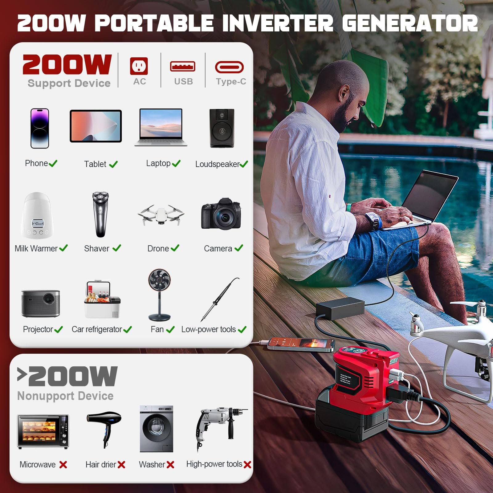 - 200 W AC Output – Converts 20 V DC to 110–120 V AC pure sine wave (up to 250 W surge) for sensitive electronics.