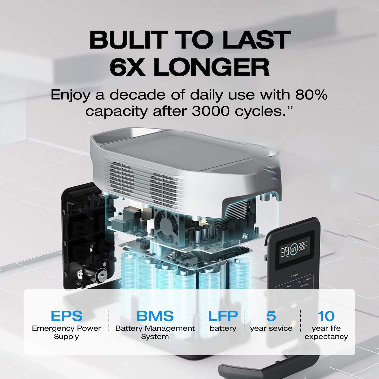 - Long-Lasting LFP: LiFePO₄ cell chemistry rated for 3 000+ cycles, maintaining > 80 % capacity after 2 000 cycles.
