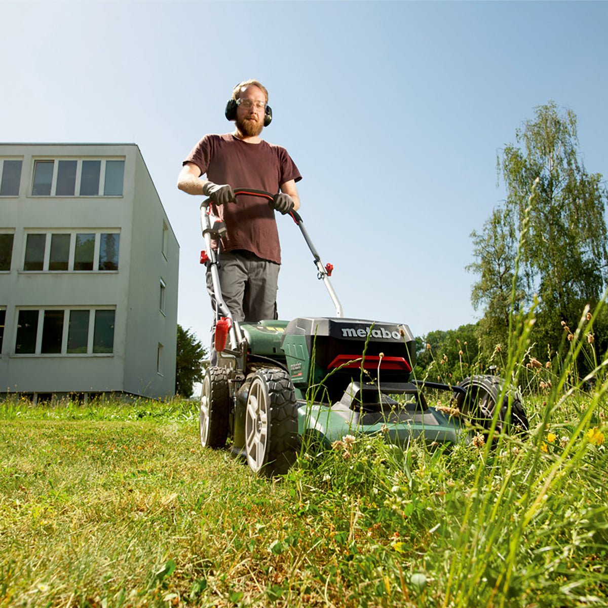 The Metabo RM 36-18 LTX BL 46 is a powerful cordless lawn mower designed for efficient mowing, collecting, and mulching on plots up to 800 m². Its brushless motor ensures high cutting performance and adapts automatically to grass height for optimized battery runtime. The 7-stage adjustable cutting height and smooth-running wheels provide precision and easy maneuverability. Built for durability, it features a robust metal cover and high-quality mower blade. Safety is enhanced with a double protection system, including a safety key and switch. Quiet and eco-friendly, it runs on two 18V batteries, making it ideal for noise-sensitive areas.